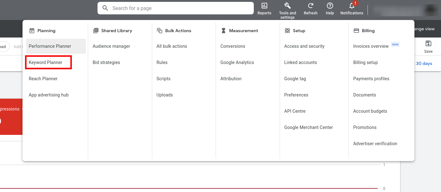 - Open the tool and click “Go to Keyword Planner”: Once set up, click “Tools” in the menu bar and select “Switch to expert mode”. Then, you’ll see a link to the Keyword Planner on the main menu page.