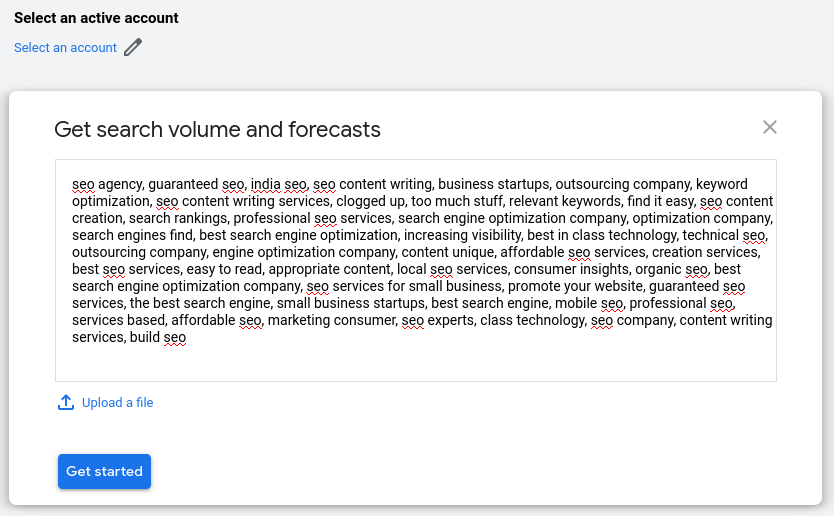 - Click “Get search volume and forecasts”: You’ll have two options: “Discover new keywords” and “Get search volume and forecasts”. Choose the second option if you already have a list of keywords that you want to load to Google.