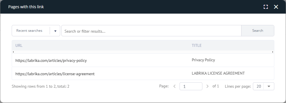 4. List of pages with a link to the error page - opens when you click on the "Show".