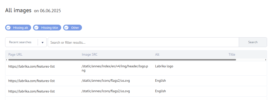 The “All images” report is located in the “Technical audit” item on the left-hand menu. It itemizes the ALT and Title attributes of your site’s images.