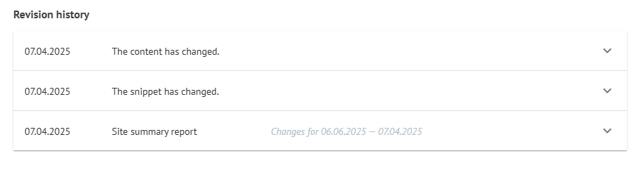 The timeline feature provides a chronological overview of changes made to the landing page over the last three months. This allows you to compare summary reports for selected dates and identify any changes that may have affected keyword positions. By clicking on the arrow next to each item, you can access more detailed information about the changes, including any updates to the snippet.