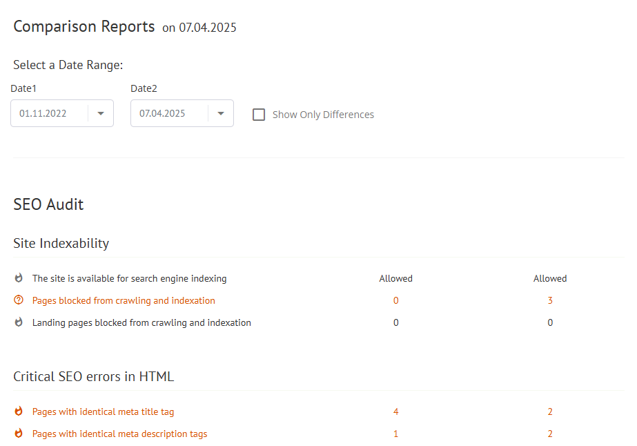 Comparison reports are analytical tools that allow users to assess the performance of their website over different time periods. By comparing specific metrics, users can identify trends, strengths, and weaknesses in their SEO strategy. This can ultimately lead to more informed decision-making and improved website performance. In Labrika, these reports provide a comprehensive overview of how various elements of your website have changed over time, allowing for a detailed analysis of optimization efforts.