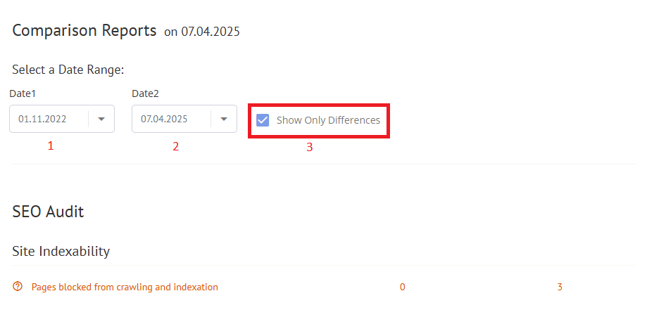 One of the standout features of Labrika's comparison reports is the option to display only the differences between the two selected dates. By ticking the "Differences only" checkbox, users can streamline their analysis, focusing solely on the parameters that have changed. This targeted approach helps in identifying significant shifts in performance metrics, making it easier to understand the effectiveness of implemented strategies.