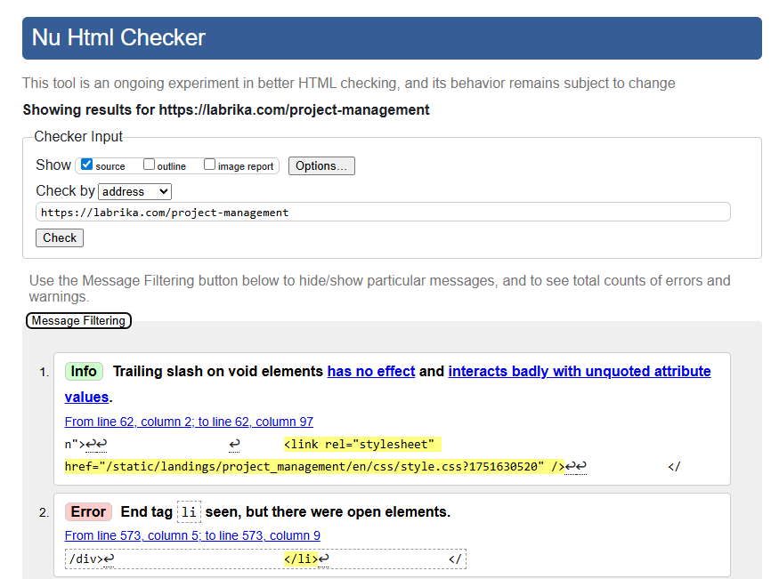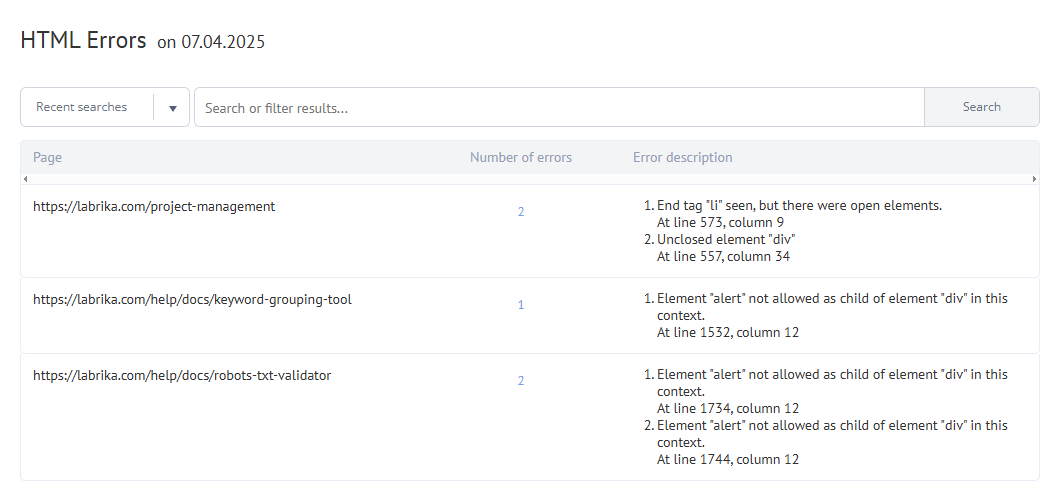 - The number of critical HTML errors found. By clicking on the number shown, you can see detailed information about all critical errors in the HTML code.
