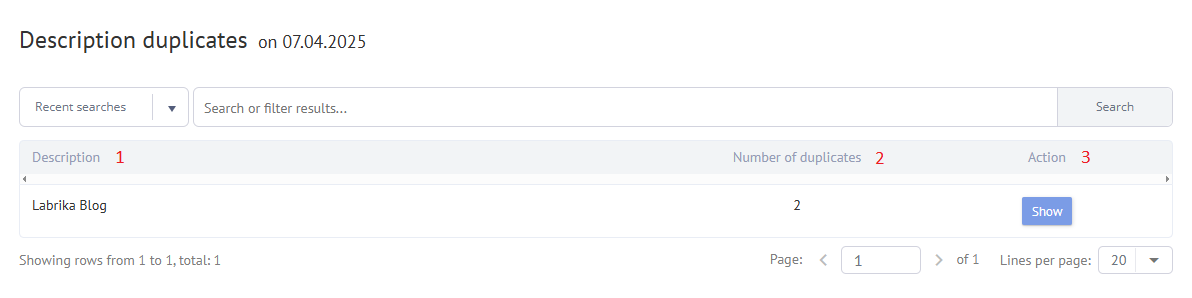 - When you click on the "Show" button in the "Action" column, a list of all pages with this Description will open.
