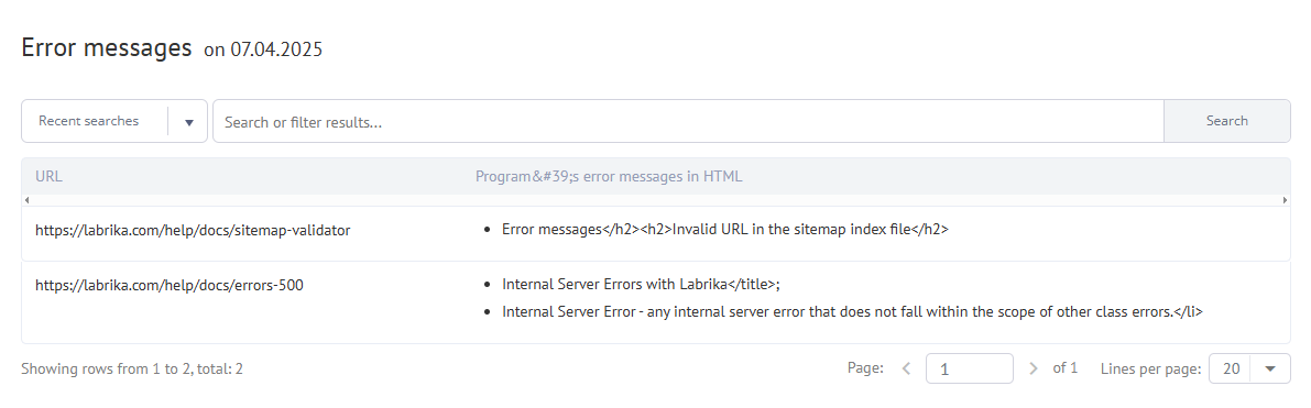 This report notifies you of all the errors that Labrika has found on your pages and the explicit error text contained within said pages.