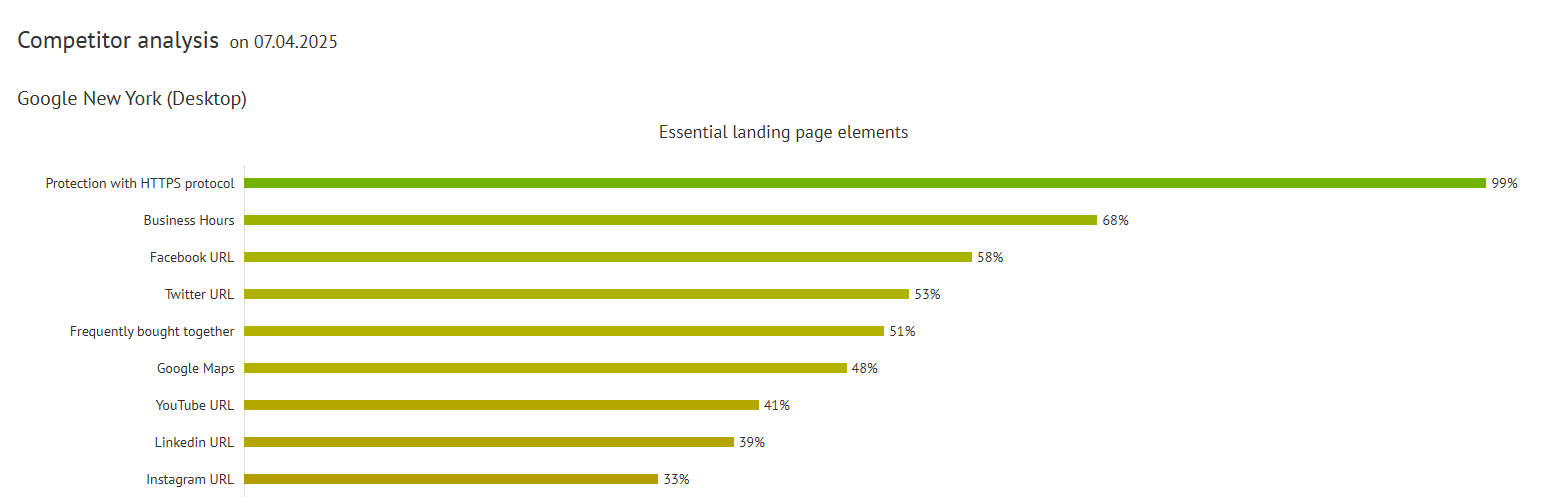 To determine which elements are essential to your landing page, you can use the competitor analysis, which will look at your top 10 competitors and analyze what elements they are using on their pages as a percentage.
