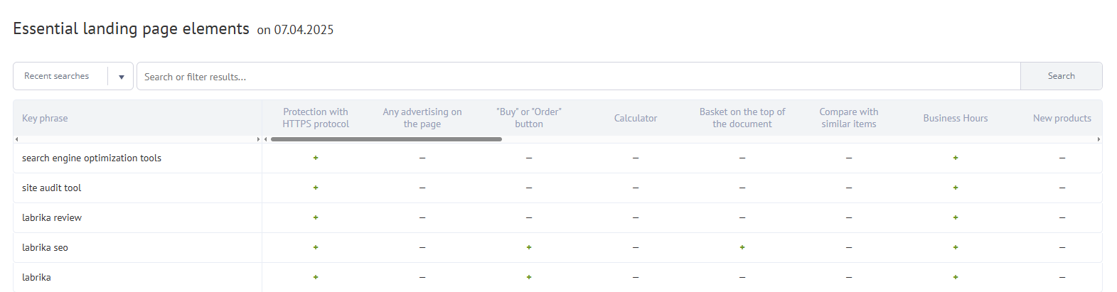Labrika’s Essential Landing Page Element tool outlines what features and elements are present on your competitors’ sites ranking in the top 10 (for keywords you also wish to rank for ), so that you know what your site needs to include if you want to rank well for said keywords.