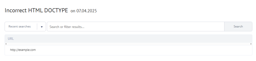The report in Labrika's dashboard will show you a list of URLs where the DOCTYPE is written incorrectly in the code or the sign “No matches found for your query” if there is no a mistake.