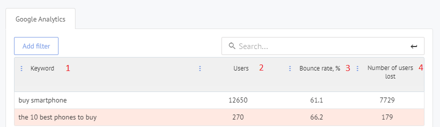 - The bounce rate for each keyword. This is calculated by the percentage of bounces out of the total number of clicks for a given phrase. A ‘refusal’ (bounce back) is specified as a quick departure from a page without clicking on anything or interacting with any content on the page.