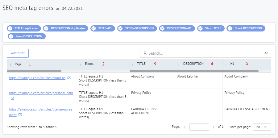 Labrika’s “Meta Tag & Heading Error” report in the SEO Audit