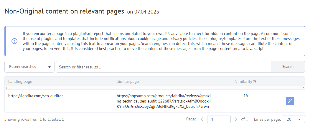 Labrika automatically checks all of your landing pages for plagiarized content whenever you start a site/page analysis.