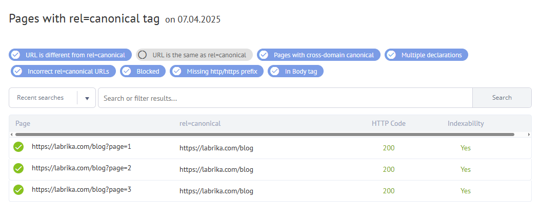 rel="canonical"tag was found. - Column 2. The URL indicated in the