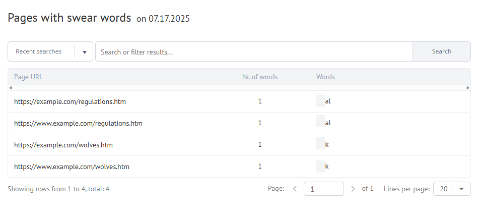 These can include any words that can be deemed offensive, obscene, or that are known swear words. If found on your site you will see a link to the URL where they are located, the amount used, and the words themselves.