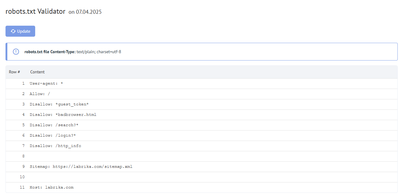 - "Refresh" button - when you click on it, the data on the errors in the robots.txt file will be refreshed.