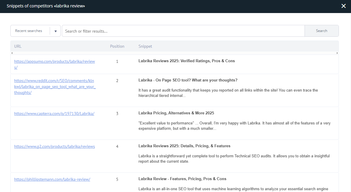 - The keyword that Labrika is comparing the top 10 snippets for.
