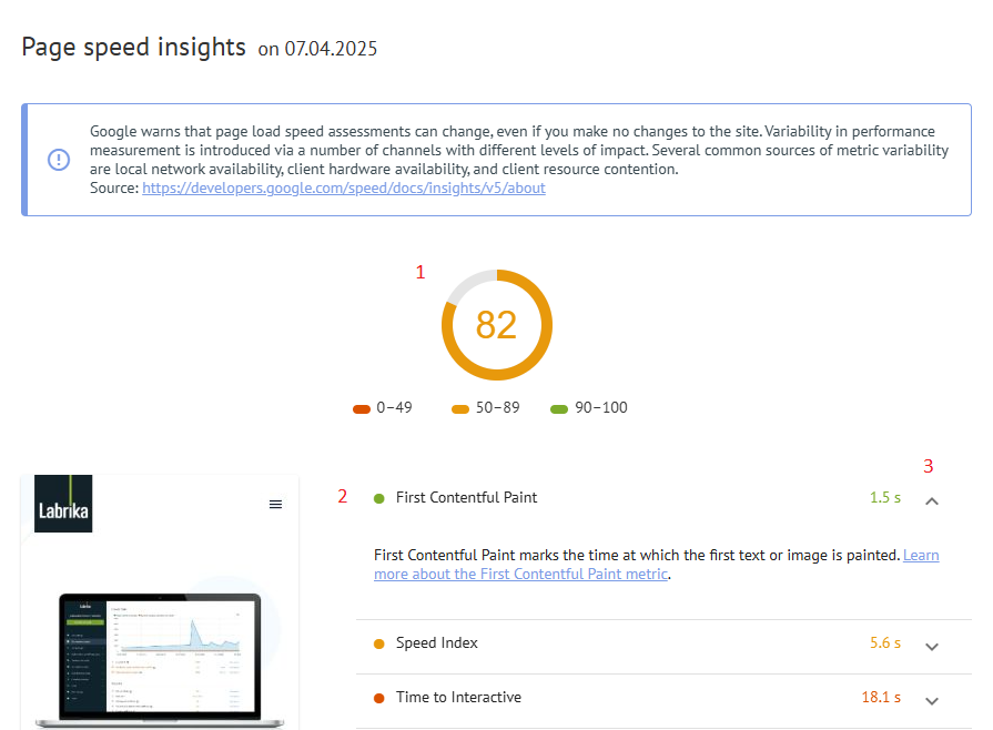 The information in the report is sourced from Google’s data. When you click on the links provided in the report, you will access explanations from PageSpeed Insights, a tool designed to evaluate page speed metrics. This tool is essential for understanding how various factors affect your website's loading speed.
