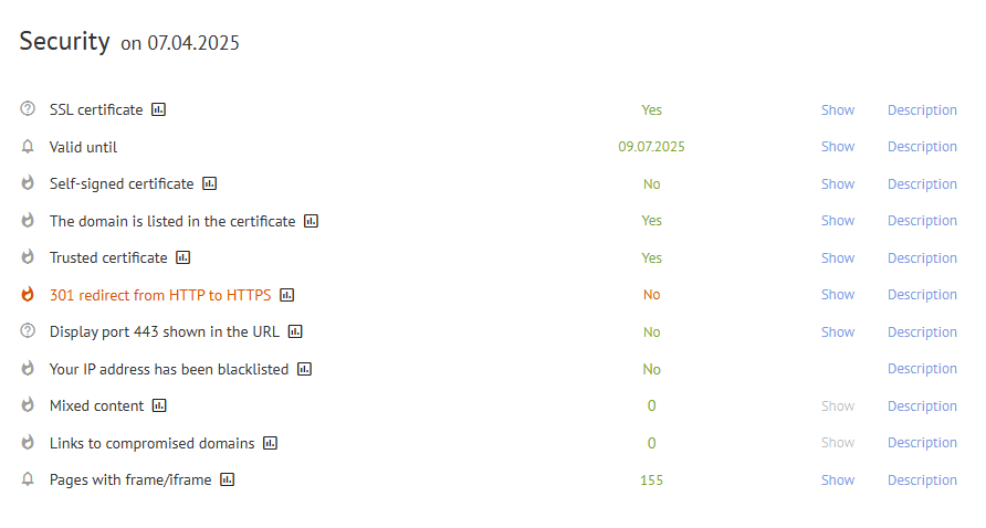 By clicking on the "Description" link, you will find tooltips with detailed information about these parameters, explaining their significance for your website's security.