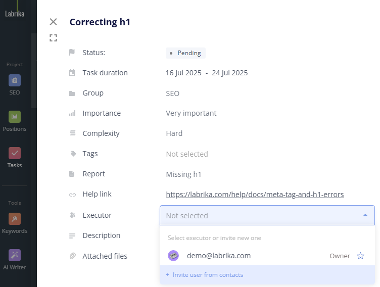 - In the "invite a new team member to the project" window, in the contacts field, select the first line "Add contact" from the drop-down list.