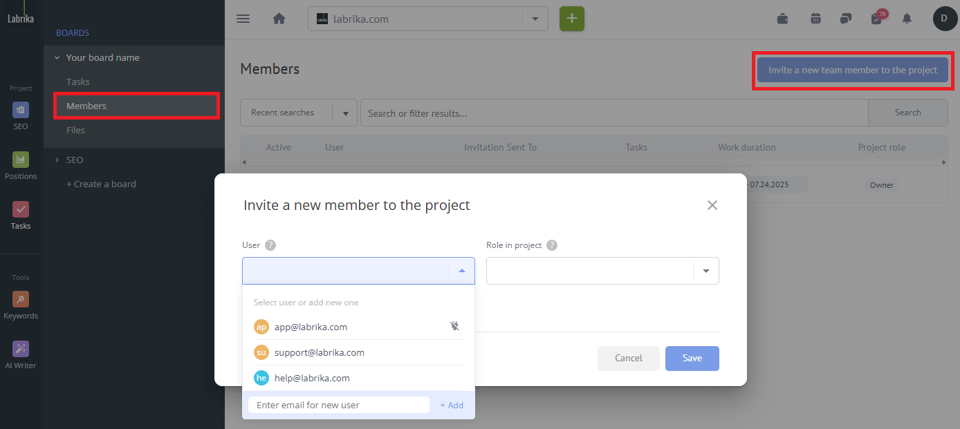- In the “invite team member” window in the upper right corner, click “Invite a new team member to the project”.