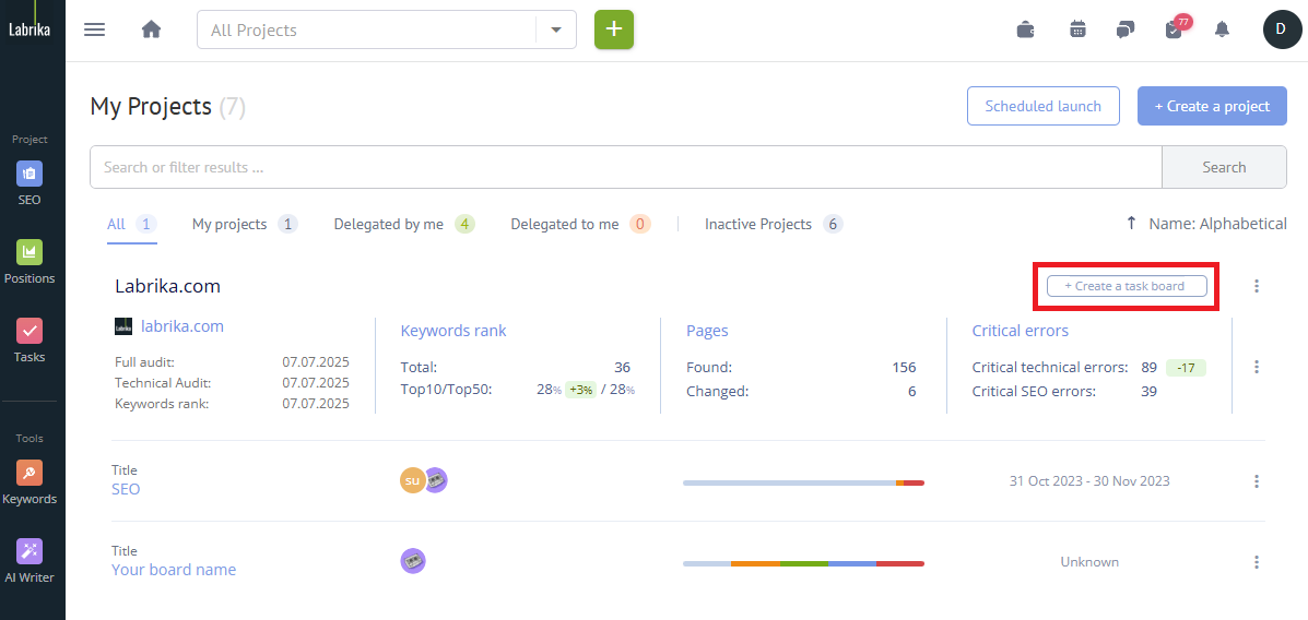 - Create a new project and manually enter each task: To start improving your website, you need to create a new project in our project management system. After that, you can manually enter each task that needs to be completed. For example, you can create a task to optimize the headings on your site or to create a more convenient navigation.