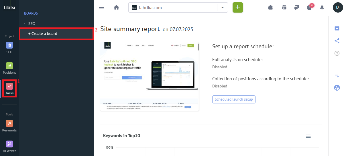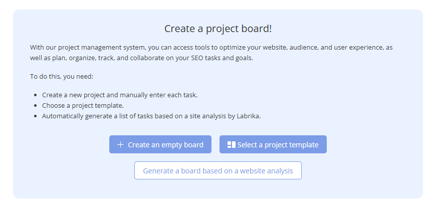 - Automatically generate a task list based on the site analysis conducted by Labrika: If you want to get an automatically generated task list that takes into account the features of your website, you can use our integrated Labrika analyzer. After the analysis, Labrika will automatically generate a list of tasks that will best meet your needs for optimization and SEO improvement. You will be able to view this list and include the necessary tasks in your project.