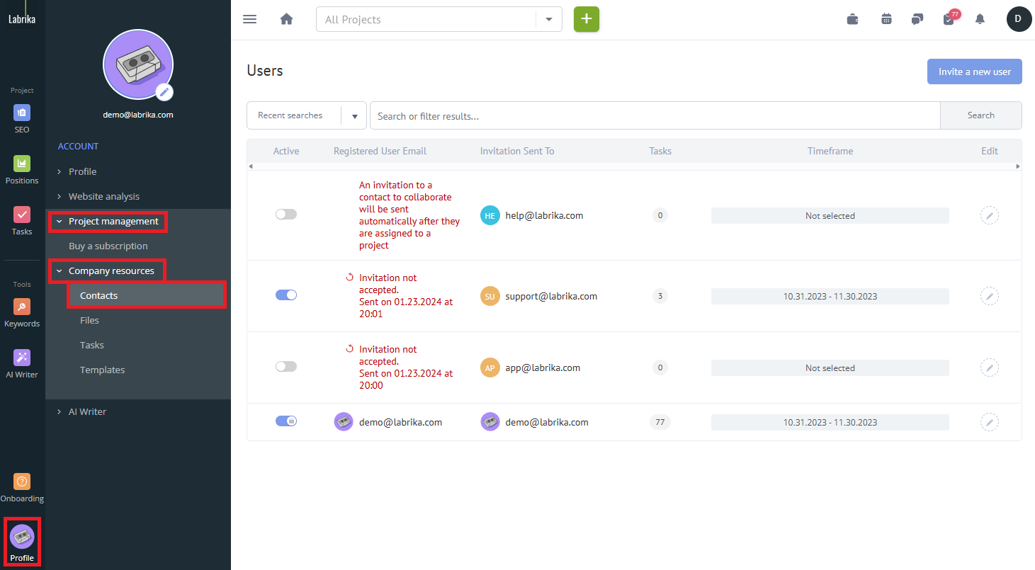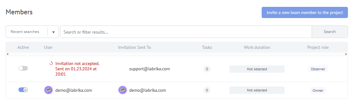- Use the toggle to block the user. When the toggle is blue, this means the user is active, and when toggled to gray, the user becomes inactive and can no longer participate in any tasks.
