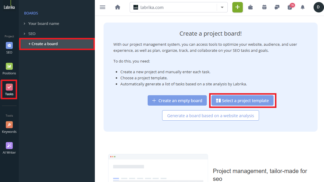 If you don't want to start your board from scratch, check out the available options in our template library and choose the most appropriate one on the project management page. You can also create and save your own board templates.