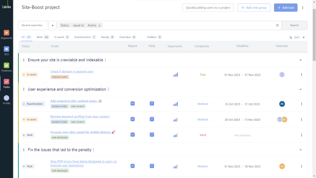 With this platform, you can easily create, assign, and track tasks, communicate seamlessly with your team and clients, transfer files swiftly, and access SEO reports automatically. Additionally, Labrika's AI technology allows you to generate a project based on an analysis of your website. In this project, tasks are prioritized according to their impact on your website's ranking, and each task is accompanied by clear and concise instructions.